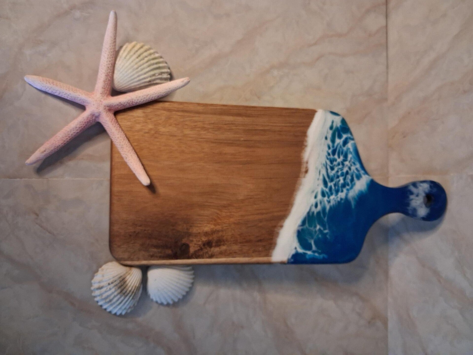 Mooie snij- en serveerplank met epoxy golven op het strand.